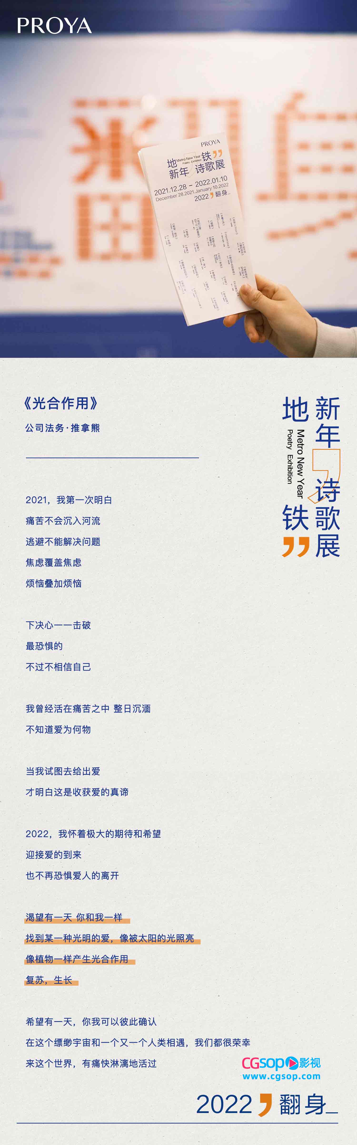 这个新年,珀莱雅PROYA选择「翻身」站举办新年诗歌展,邀请27位诗人以「希望」为主题,写下新年的第一首诗,其中有已经出版过诗集的作家、诗人、学者,也有学生、算法工程师、矿工、农民、音乐人、企业职员;同时,我们也询问了更多朋友他们心中关于新年的种种意象,以共创的形式一起写下长诗《新年是什么》。在新年的时刻,诗歌是我们共同的语言,这些关于新年的诗句,也都关于希望。