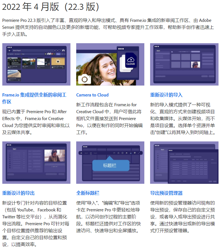 PR 最新版本号是 22.3,新增功能主要有丰富、直观的导入和导出模式,具有 Frame.io 集成的新审阅工作区,离线语音转文本新增广东话,重新混合的进度指示器等等新功能。