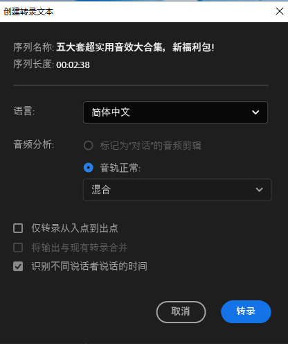 在菜单栏窗口选择文本,然后点击创建转录,默认是整个系列视频,也可以从入点到出点,选择语言接着点击转录。