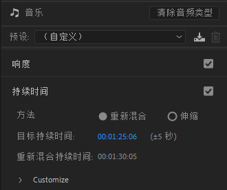 在菜单栏窗口点击打开基本声音,点击音乐,勾选上持续时间,更改持续时间,即可完成重新混合,就是这么简单。