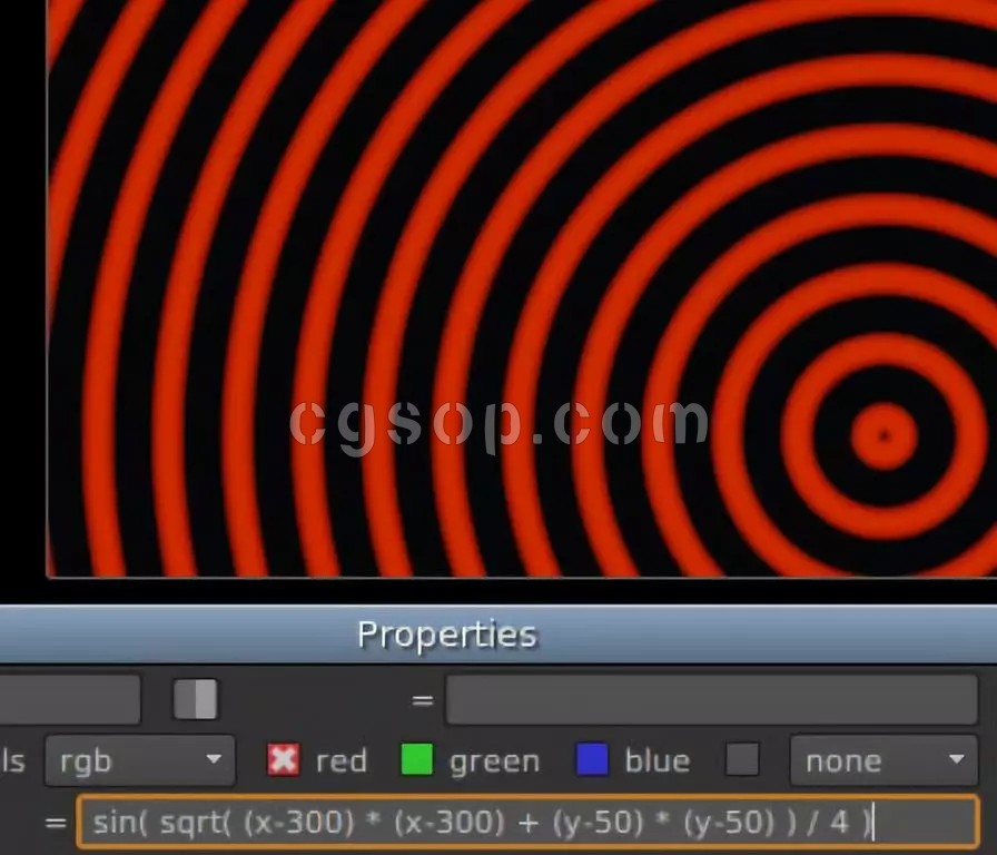 例如,让我们将中心点移动到(300,50):sin(sqrt((x-300) * (x-300) + (y-50) * (y-50) ) / 4)