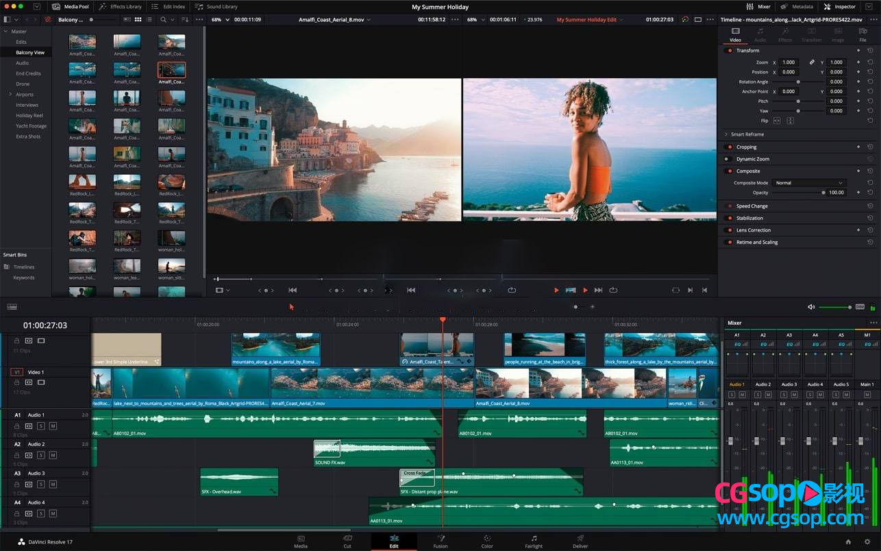 具、对声音库的支特、用于快速同步声音的音频和视频滚动条、滚动时问线、标准化和 Fairight FX 插件,包括嗡嗡声去除器、去齿塞、混响等。DaVinci Resolve Studio 17 还增加了对生成和编辑 Dolby Atmos® 家庭包的支持!
