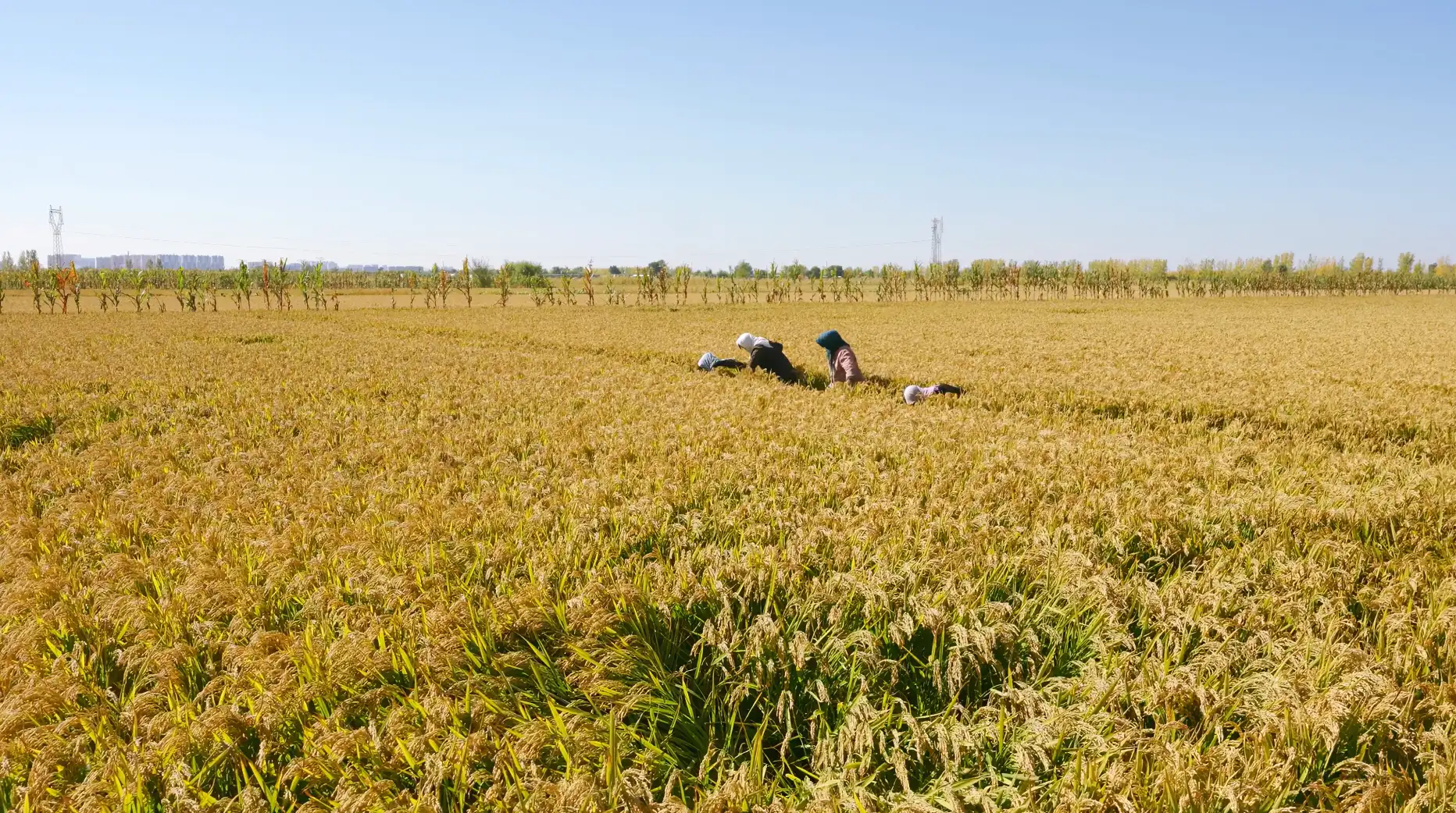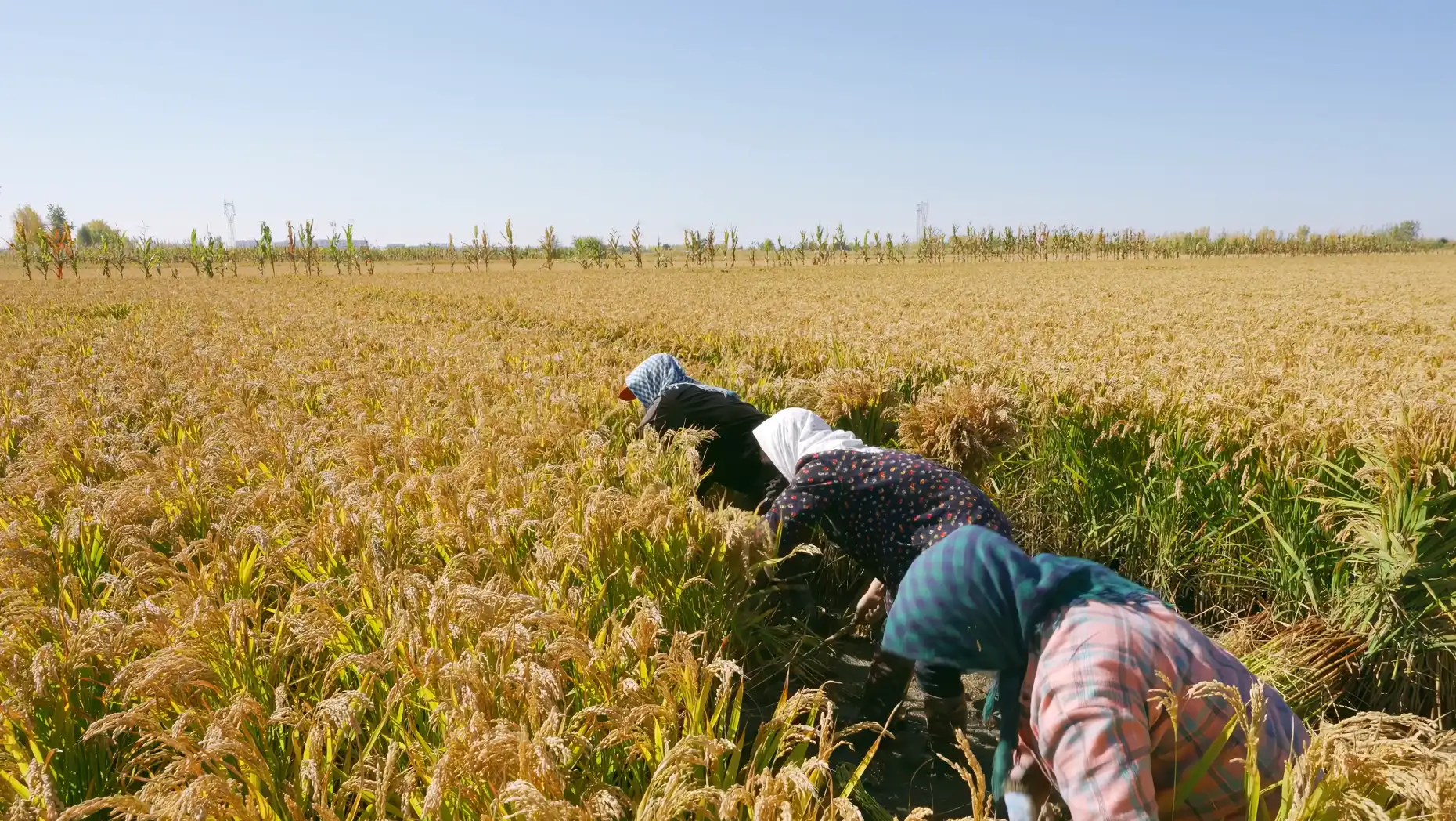 农民在田地里收割水稻