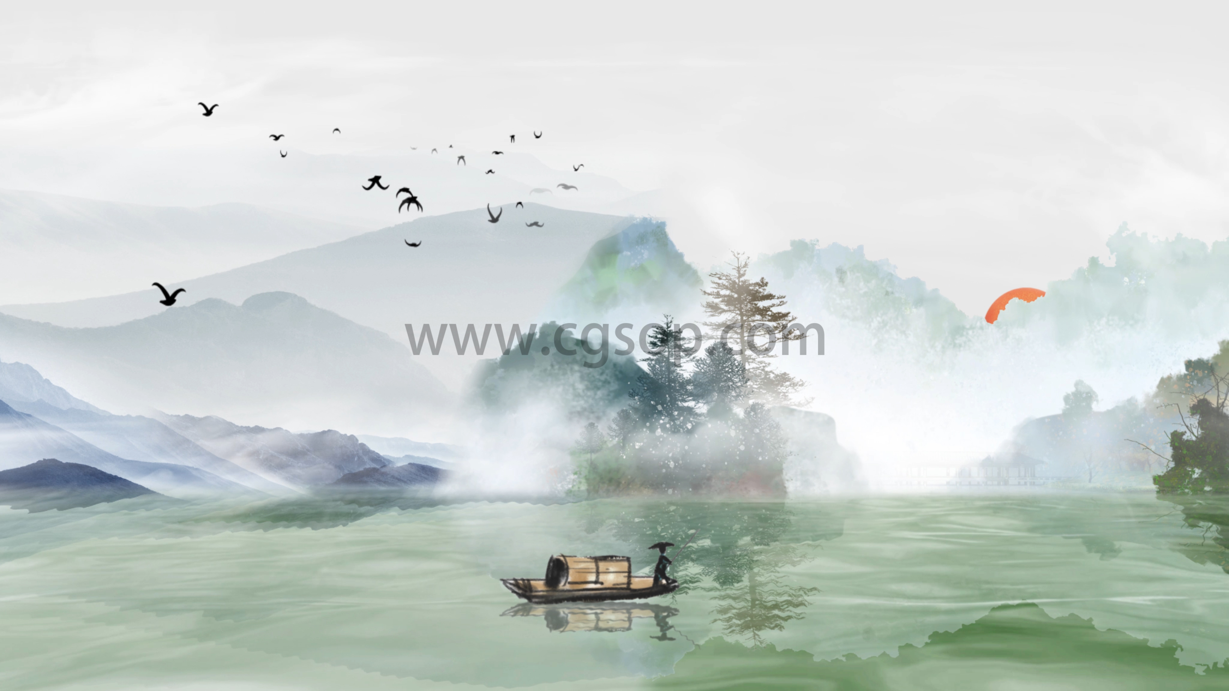 4K中国风山水意境小船诗朗诵背景
